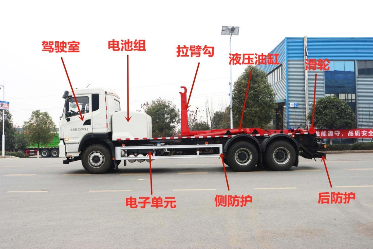 純電動車廂可卸式垃圾車是在純電動二類底盤的基礎上,加裝垃圾箱勾臂、液壓系統,由機械、液壓